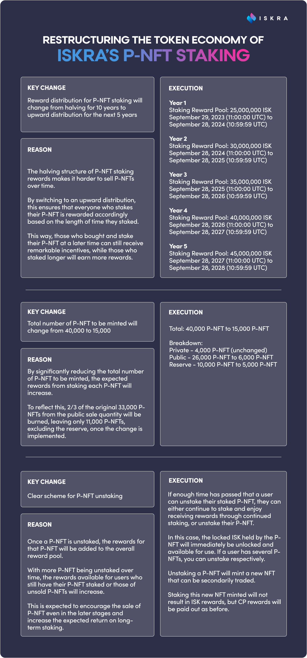 These changes reflect Iskra’s goal to make the P-NFT staking reward system compelling and attractive for every P-NFT holder to stake – whether they bought early or purchased later on.