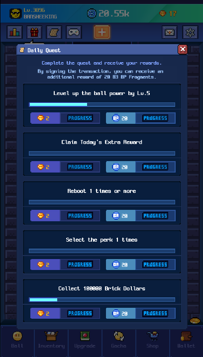 Complete quests every day to receive Brickstone rewards. You can also earn additional BP fragments when you sign in with your Iskra wallet.