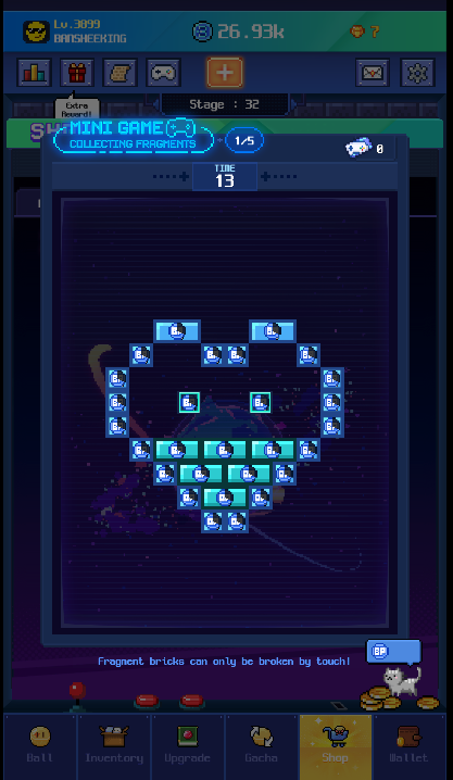 This is a fragment-collection game where every brick appears as a fragment brick that you can clear by tapping within 20 seconds.